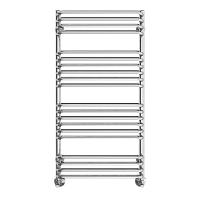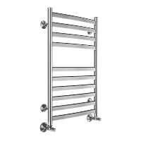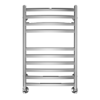 Модель "Контур с полкой" относится к линейке в стиле хай-тек, тяготеющей к лаконичным формам и хромированным поверхностям, и отличается наличием дополнительной прогреваемой полки для хранения и сушки полотенец.