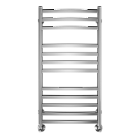 Модель "Контур с полкой" относится к линейке в стиле хай-тек, тяготеющей к лаконичным формам и хромированным поверхностям, и отличается наличием дополнительной прогреваемой полки для хранения и сушки полотенец.